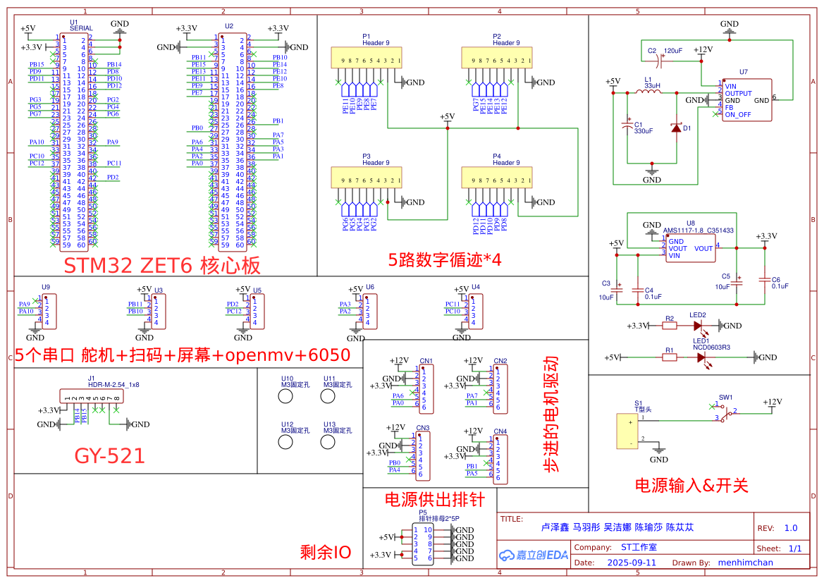 <p>本项目硬件系统围绕 STM32F103ZET6 主控芯片构建,通过精心设计的电路连接各个功能模块,实现了从感知到执行的完整闭环控制。如图2 EDA原理图、图3 PCB原理图所示。</p>